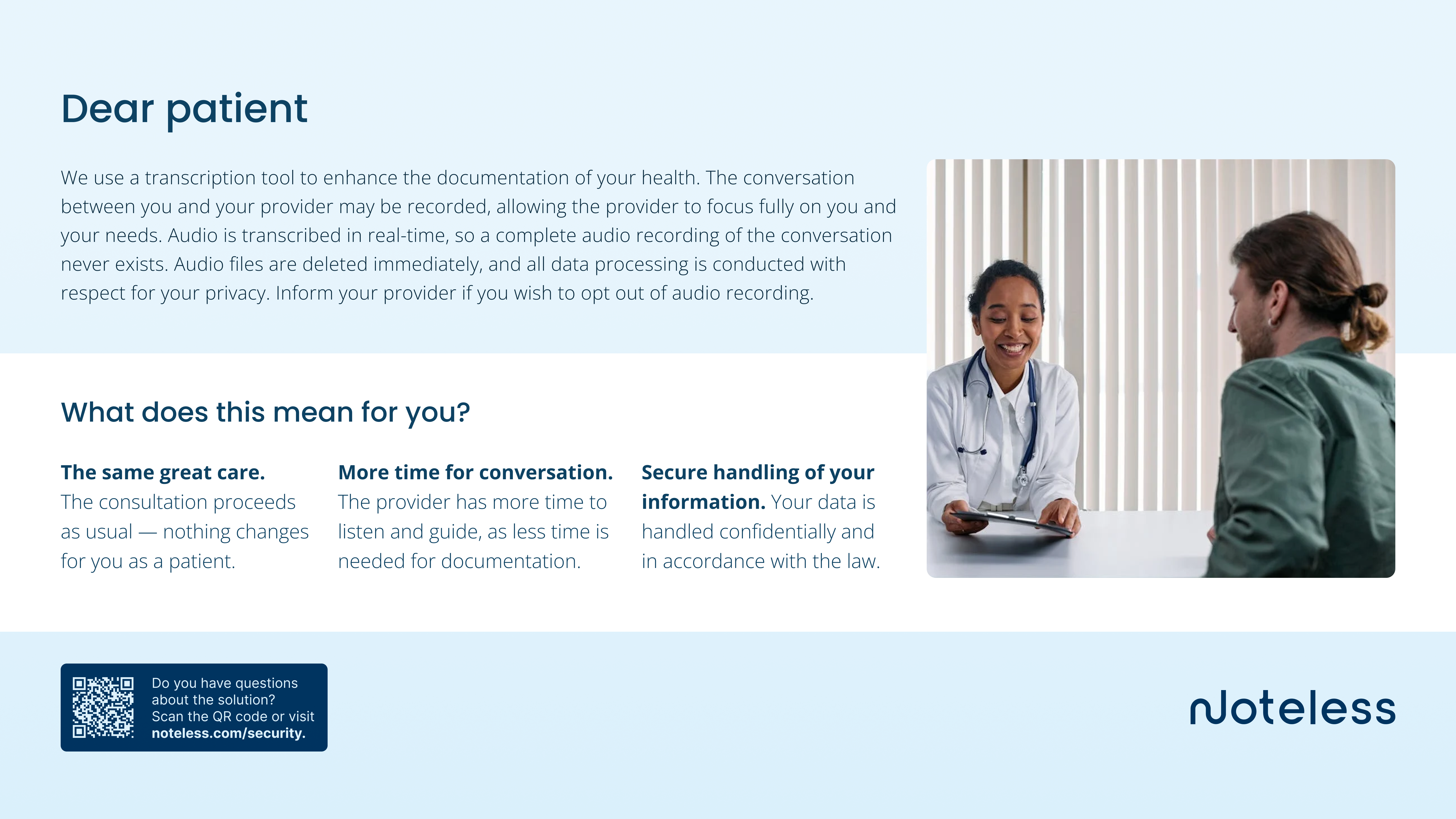 According to the World Health Organization (WHO), healthcare providers are required to inform patients about the use of artificial intelligence, just as they must disclose which electronic health record (EHR) system is used. As such, we encourage customers to inform patients about the use of Noteless, and have created information resources dedicated to this purpose, as displayed in the section below.